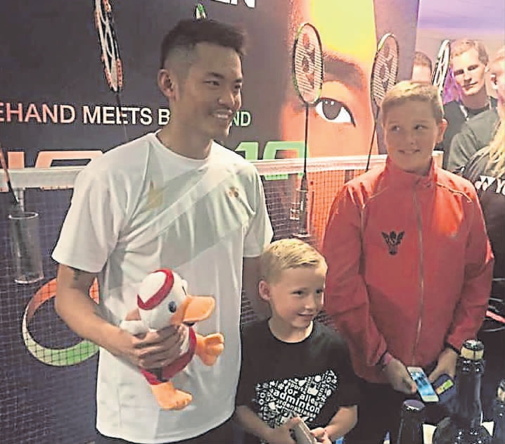 周三庆祝32岁的中国名将林丹, 在丹麦公开赛主办方安排下手握生日礼物可爱鸭子和球迷互 动。