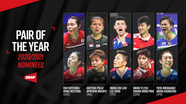 最佳双打组合:金昭映/孔熙容(韩国/女双)、波莉/拉哈尤(印尼/女双)、王懿律/黄东萍(中国/混双)、李洋/王齐麟(中国台北/男双)、渡边勇大/东野有纱(日本/混双)