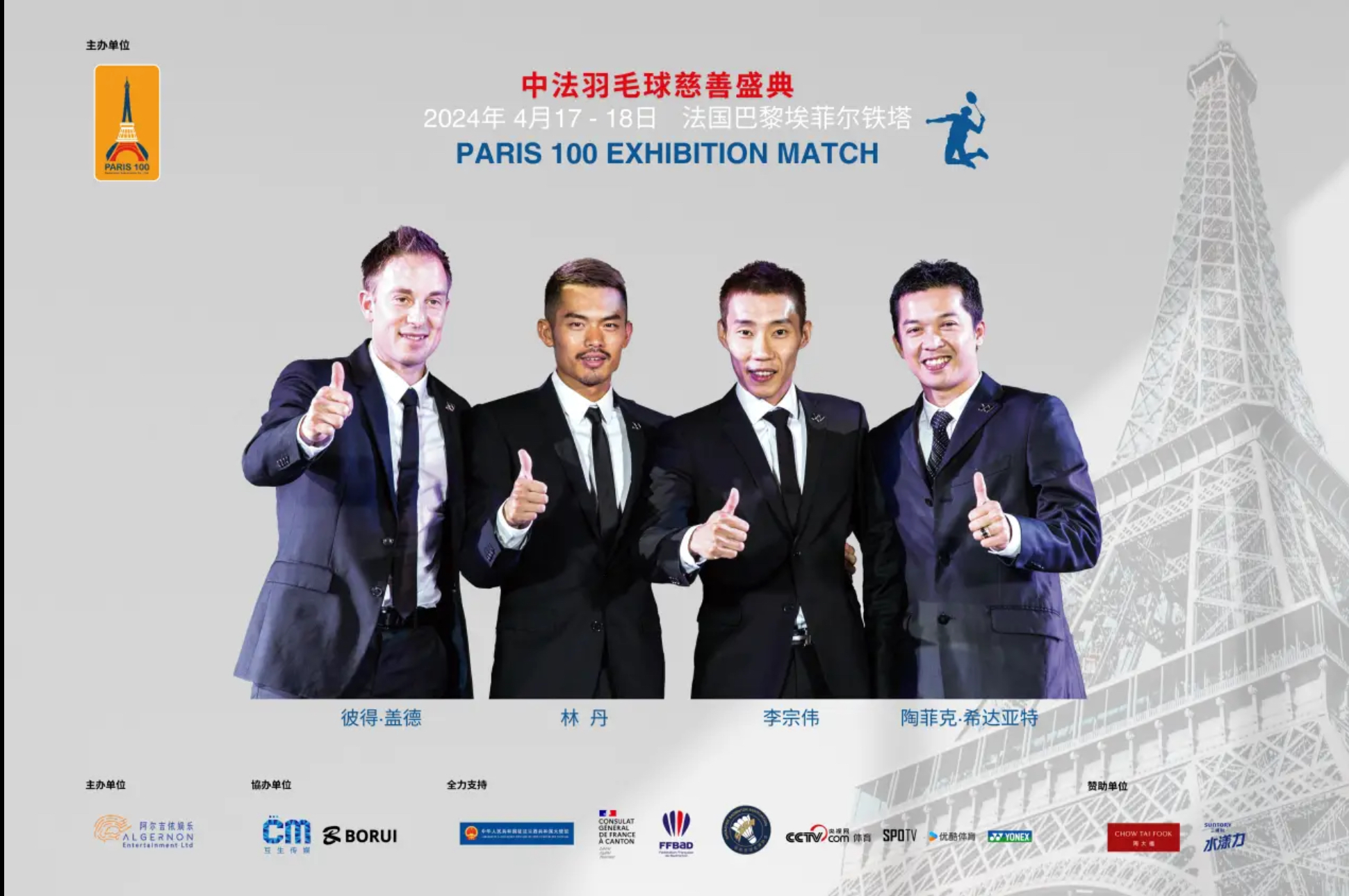这场名为“巴黎100中法羽球慈善盛典”的活动由奥运冠军林丹发起,于4月17日至18日在巴黎举办。