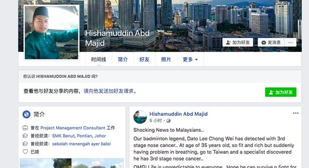 北京时间9月21日,体坛传来了一个大消息!马来西亚一位名叫Hishamuddin AbdMajid的网友在社交平台上写道:让马来西亚人震惊的消息:我们的羽毛球传奇被诊断为鼻癌3期!35岁的年纪,如此健康富有,但却突然有了呼吸道问题,去到中国台湾看病,结果被专家诊断为鼻癌3期!天啊!命运对每个人都是不可预测的!希望他能同病魔战斗,为你祈祷!